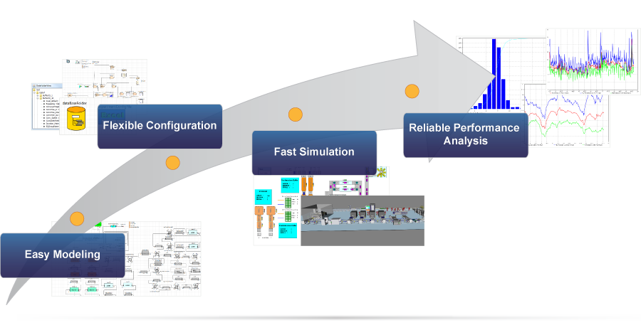 Risikominimierungen durch frühzeitige Konzeptvalidierungen, Zeit- und Kosteneinsparungen durch optimierte Planungen sowie ansprechende Visualisierungen sind die überzeugenden Vorteile, die die Kunden durch unsere Simulationsmodelle erhalten. Bei deren Erstellung setzen wir auf AnyLogic, das Simulationswerkzeug unseres Partners XJTEK, sowie die acp-IT InFrame Synapse Simulation Suite für AnyLogic, in die unsere langjährigen Simulationserfahrungen eingeflossen sind. Durch den Einsatz unserer Bibliothek und der darin enthaltenen vorgefertigten Funktionalität können Modelle in kürzester Zeit aufgebaut werden. Hierbei achten wir auch auf umfangreiche Konfigurationsmöglichkeiten, damit Modell- bzw. Systemparameter durch wiederholte Simulationsausführungen optimiert werden können, ohne dass Modelländerungen notwendig werden. Eine anschauliche Darstellung der Simulationsergebnisse ist selbstverständlich. Nachfolgende Abbildung verdeutlicht den Gesamtablauf. .