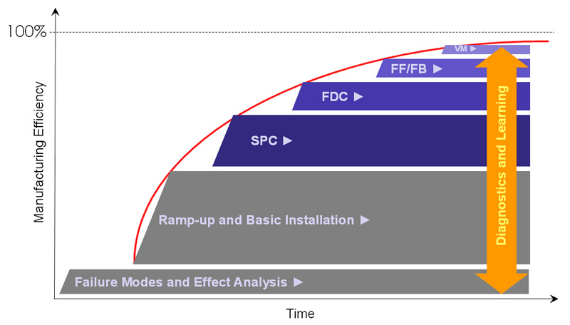 Starting with Statistical Process Control (SPC) and Measurement System Analysis (MSA) ensuring state-of-the-art yield efficiency (based on measurement and quality data) the next step is usually improved monitoring of processing equipments (also known as Fault Detection and Classification – FDC). This step gains higher equipment availability through optimized maintenance. Governing both – measurement, quality and equipment data – implicitly leads to advanced process control techniques like Feed Forward and Feed Backward (FF/FB) or Run-by-Run Control (R2R) and predictive technologies like Virtual Metrology (VM).
